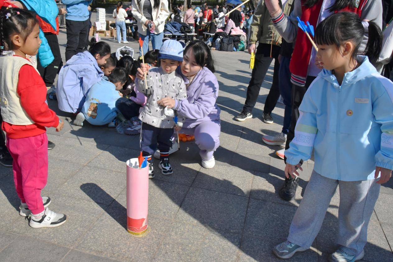上午9時30分,活動正式拉開帷幕,一場場充滿趣味與溫情的親子游戲輪番上演。“珠行萬里”項目中,家長與孩子手持半圓槽拼接通道,小球滑落時共同默契重整,掌心相對間不僅傳遞著力量,更凝聚著親情;壺中“箭”寶環(huán)節(jié)融入傳統(tǒng)元素,家長們手把手帶領孩子瞄準投擲,每一次成功入壺都引發(fā)全場歡呼;“筷子夾乒乓球”項目磨練耐心技巧,孩子們模仿家長動作小心翼翼夾球,有的家庭還創(chuàng)意發(fā)明“接力夾球”玩法,現(xiàn)場加油聲、歡呼聲交織成群。