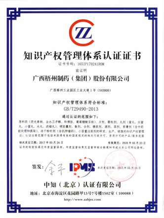 梧州制藥作為制藥企業(yè)將知識產(chǎn)權放在企業(yè)管理的戰(zhàn)略高度,在2017年4月通過了知識產(chǎn)權管理體系認證。通過貫徹《企業(yè)知識產(chǎn)權管理規(guī)范》GB/T 29490-2013,公司整合規(guī)范,構建了科學合理的知識產(chǎn)權管理體系,形成了一套系統(tǒng)適合自身的完整知識產(chǎn)權管理制度、體系、程序和管理方法。